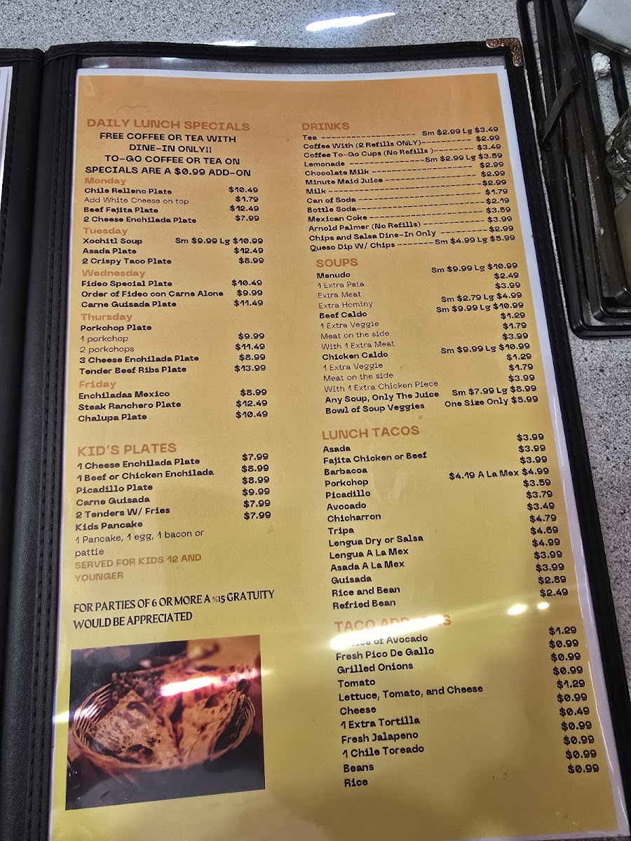 - Entrée Plates: Dishes like Carne Guisada Plate, Fajita Plate, Chile Relleno, and Quesa Compuesta Plate, serving as main course options with traditional Mexican flavors.