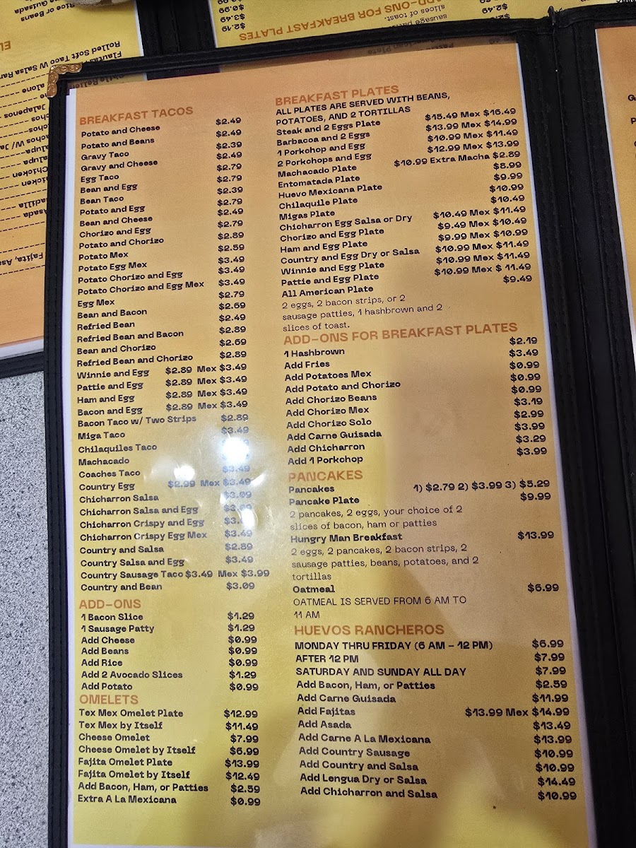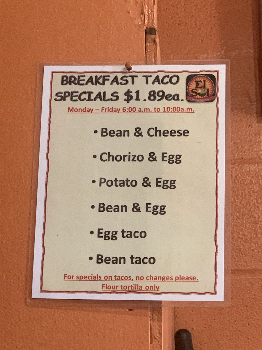 - Breakfast Items: Including breakfast tacos with ingredients such as crispy bacon, eggs, chorizo with eggs, and potato with egg, suitable for morning dining.